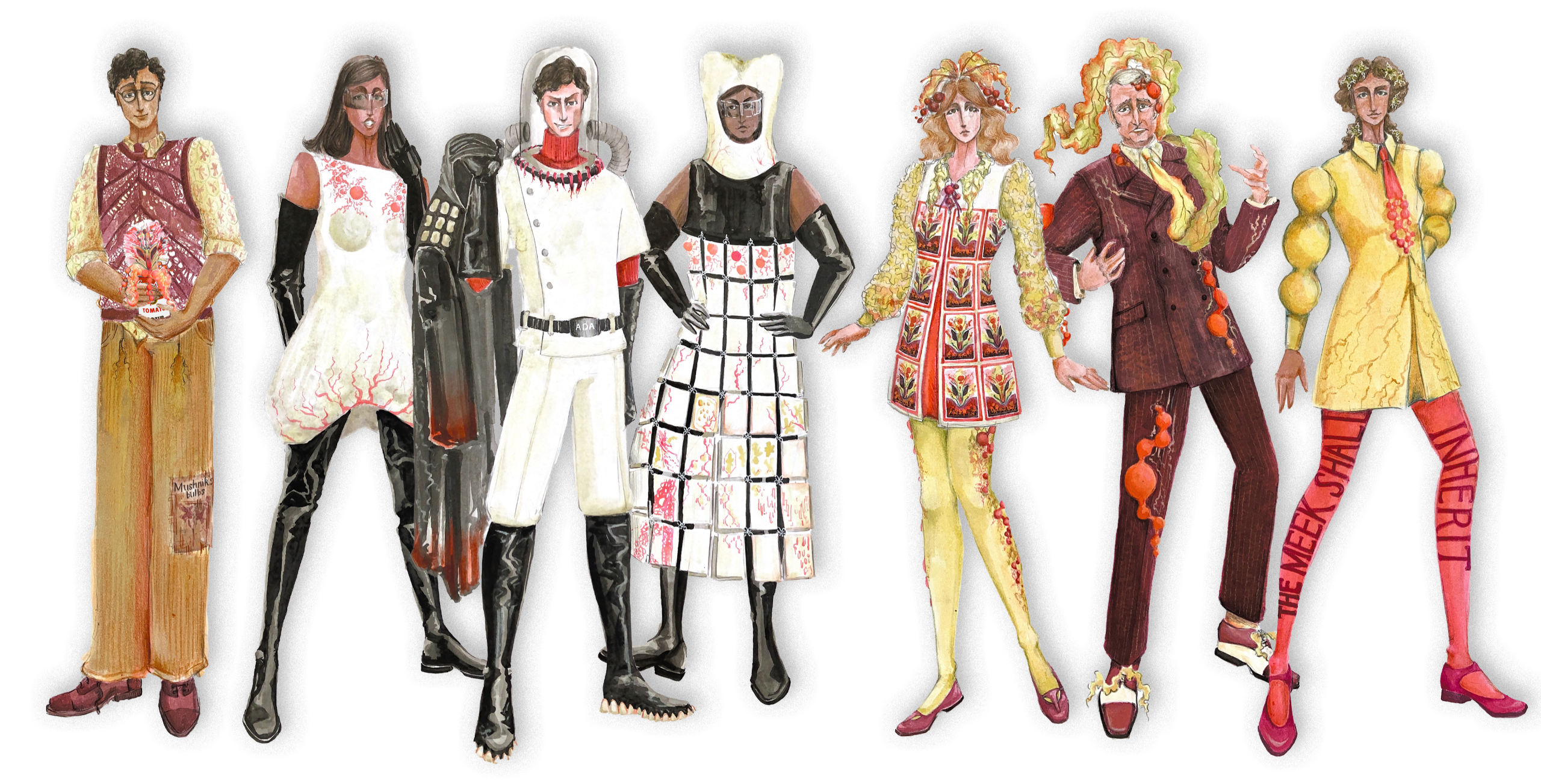 I have placed this adaptation in the 1960s, taking inspiration from Pierre Cardin and The Campbell Souper Dress to convey a strong sense of consumer culture through fad fashion designs. The tooth shape costume was made by carving a tooth shape from foam and forming felted fosshape around it.