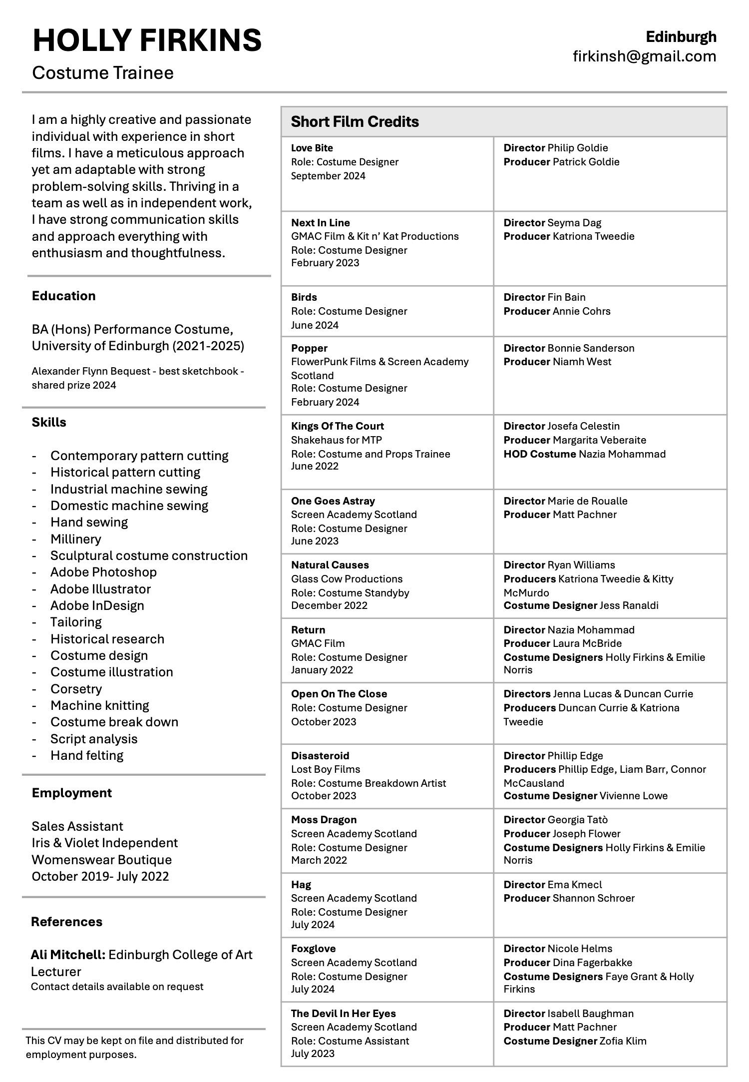 Costume Designed by Zofia KlimRole: Costume Assistant